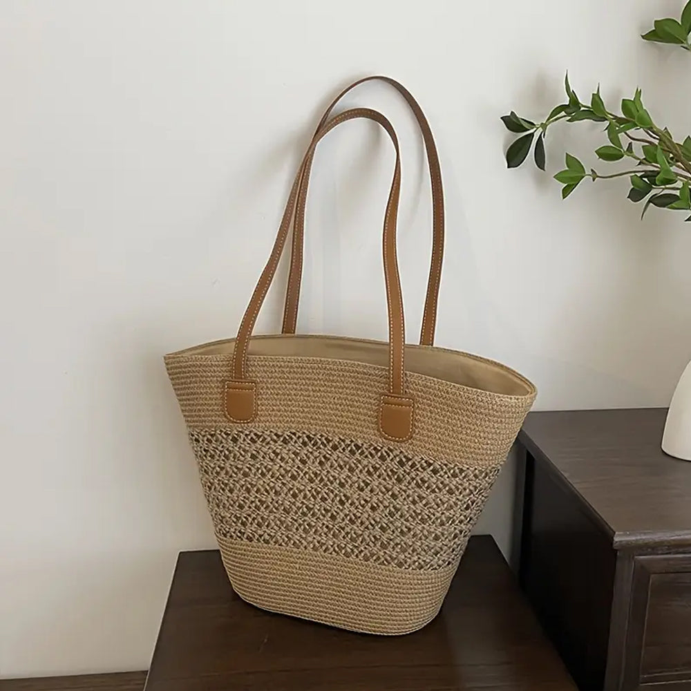 Khaki Straw Woven Tote Bag - Braided Design