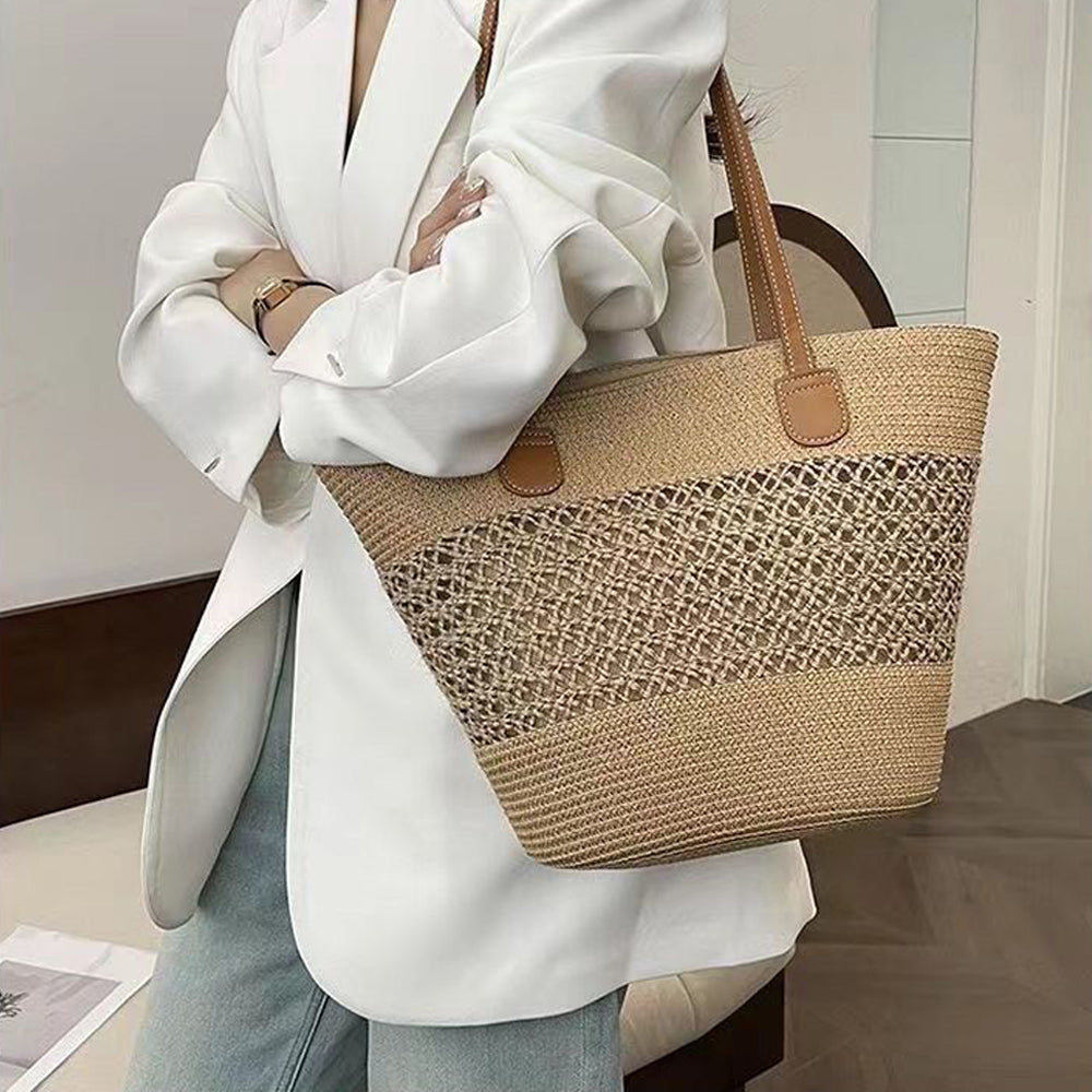 Crafted from natural high-quality materials, this summer tote bag combines a lightweight feel with a durable construction to ensure long-lasting performance, even with frequent use. The stylish braided central pattern that elevates its appearance, while the eco-friendly straw weave promises effortless maintenance and easy storage.