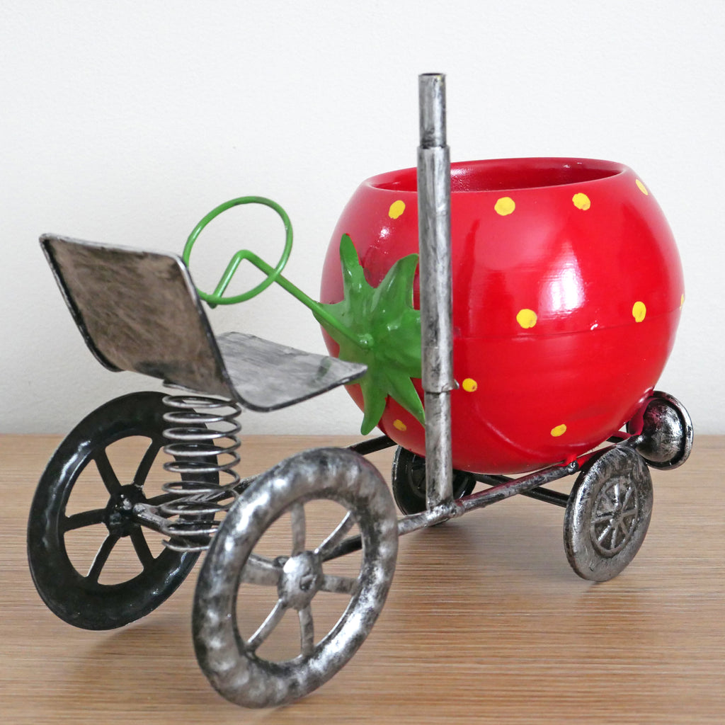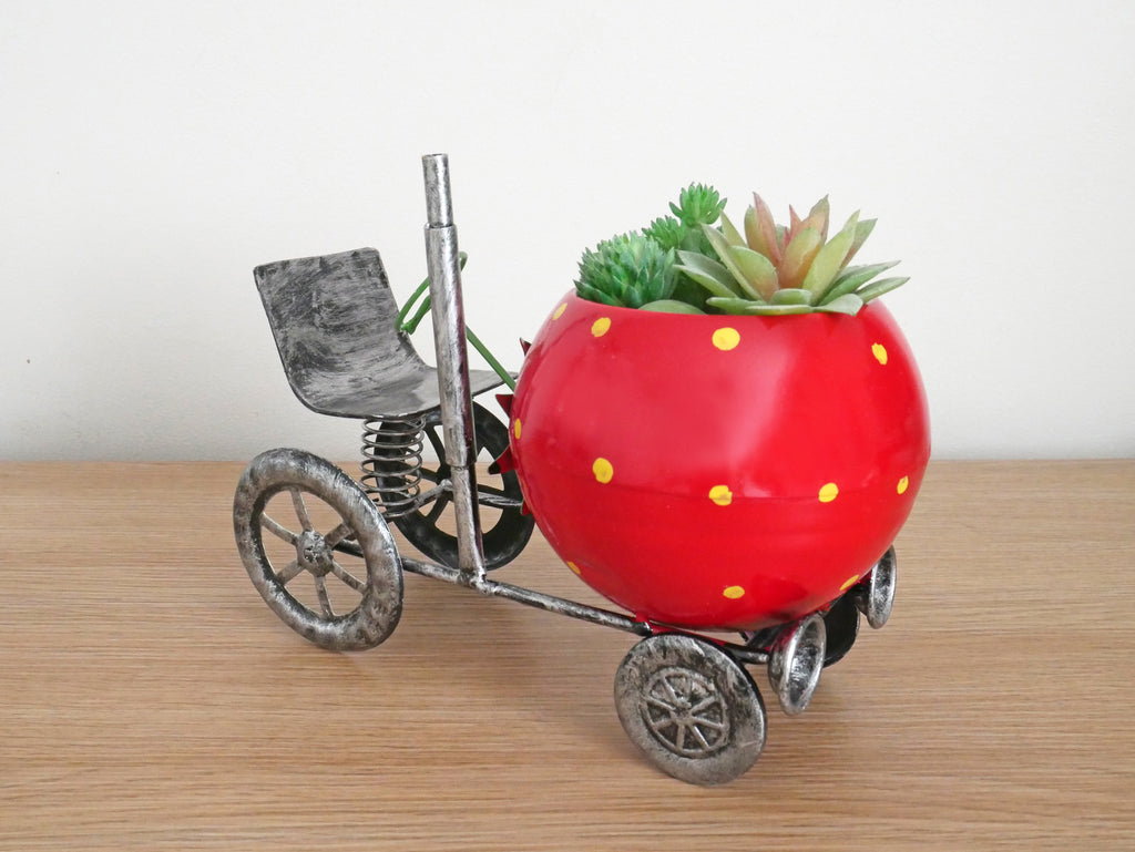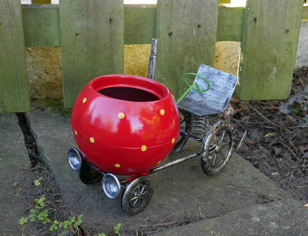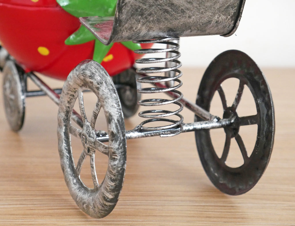 This novelty Tractor plant pot is simply stunning in design; the strawberry shape front planter adds a touch of quirkiness and fun to the piece and contrast beautifully against the distressed darker tones of the frame, wheels, and seat. This small ornamental flowerpot is handcrafted using high quality, durable and weather resistant metal, which has also been given a special UV protective coating to prevent fading in the sun. The coil spring seat adds animation to the sculpture as it gently bobs in the breeze, the wings can also be posed according to your requirements. Add your favourite flowers or plants and put this striking Tractor flower pot out on your patio, lawn, porch, or garden wall; this lovely piece would also serve as a wonderful unique shelf sitter inside the home. Ideal for small shrubs, flowers, cacti, herbs, and artificial plants and flowers. Specifications